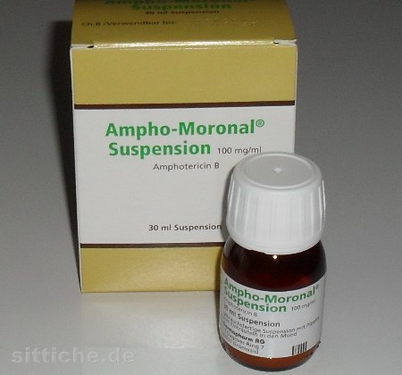Das Amphotericin B gibt es in wasserunlöslicher Form (Ampho-Moronal) und in wasserlöslicher Form (in den USA gibt es Medikament mit Namen "Megabac-S") und ist verschreibungspflichtig. Das wasserunlösliche Mittel ist eine orangefarbene Suspension (Antimykotikum) und hierzulande gebräuchlicher als das wasserlösliche Präparat. Das Ampho-Moronal wird mit Hilfe einer kleinen Spritze per Schnabel eingegeben. Die Behandlung muss zweimal täglich erfolgen, morgens und abends je einen Tropfen. Da auch das Einfangen des Vogels Stress bedeutet, braucht man eine gewisse Übung, ihn schnell zu fangen und sicher in der Hand zu halten. Eine Anleitung wie der Fixiergriff funktioniert findest du hier: Fixiergriff