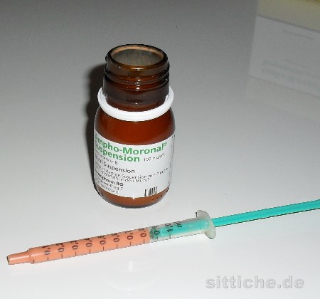 Zweite Variante: 2 Teelöffel Futter in einen kleines Schnapsglas oder ähnliches geben und vier Tropfen Ampho-Moronal darüber geben und vermischen. Eine Nacht einziehen lassen und am nächsten Tag kurz umrühren, dann in zwei Portionen aufteilen und morgens und abends verfüttern.