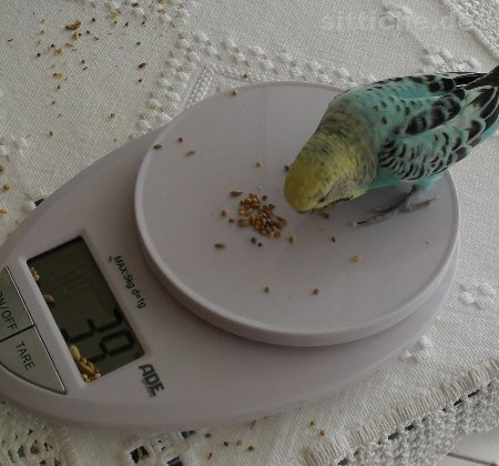 Regelmäßige Gewichtskontrolle! Man sollte sich angewöhnen, seine Vögel regelmäßig zu wiegen, so hat man bei einer Gewichtsabnahme einen ersten Hinweis. Das Wiegen kann man spielerisch mit seinen Wellensittichen üben.