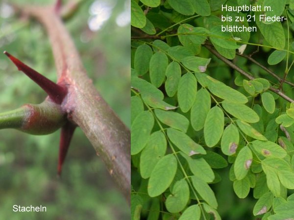 Echte Akazien gibt es in unseren Breitengraden kaum. Das, was wir als Akazien bezeichnen, sind in Wirklichkeit Robinien, auch Scheinakkazien genannt, diese besitzen Dornen. Man sieht sie oft als Straßenbepflanzung in den Städten und diese sind stark giftig für Mensch und Tier und zwar die ganze Pflanze. Also Finger weg von Hölzer, Blätter oder Früchte! Die Akazie ist von der Esche durch ihre ungezähnten Blätter zu unterscheiden und natürlich besonders durch ihre Dornen.