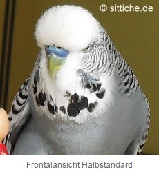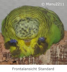 Standards sind nach bestimmten Richtlinien gezüchtet worden - sie sind größer als die Hansi-Bubis, und meistens auch nicht ganz so quirlig. Es sind sehr markante Vögel, die durch ihre imposante Erscheinung auffallen. Sie haben einen gedrungenen kräftigen Körperbau, der Kopf ist breiter, die Stirn etwas vorgewölbt und das Kopfgefieder ist länger. Dadurch wirken die Augen eingesunken und sind oberhalb durch Federn oftmals verdeckt, wodurch sie einen etwas strengeren Blick haben. Auch sind die Kehltupfen größer. Ein Standard kann zwischen 21 und 26 cm groß sein. Sie können sich auch noch in weiteren Kleinigkeiten unterschieden, siehe unter dem Punkt Schauwellensittich. Die Augen sind nicht mehr aus jeder Perspektive zu erkennen.